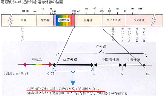 赤外線は太陽光線の一種で、熱を送る光のことです。 赤外線は波長0.76~4ミクロンの近赤外線と、波長4~1000ミクロンの遠赤外線に区分され、わたしたちの身体に最も有効とされる波長は8~24ミクロンとされています。皮膚への透過吸収は近赤外線で最も大きく、深さは30mmに達します。近赤外線は対象物を直接暖める性質を持つ光線です。その性質は、主に皮膚の表面だけを温めるものです。一方、遠赤外線は対象物を直接暖めるはたらきはありませんが、有機物を内部から暖める性質があります。